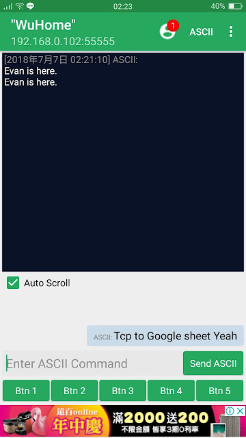 4. 手機傳送訊息至 Python (出現第二次 "Evan is here." 表示 Python 已經把資料傳上去 Google sheet 並且重新連結上 TCP Server)
